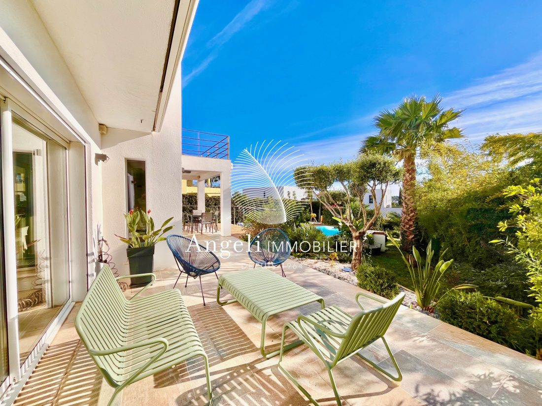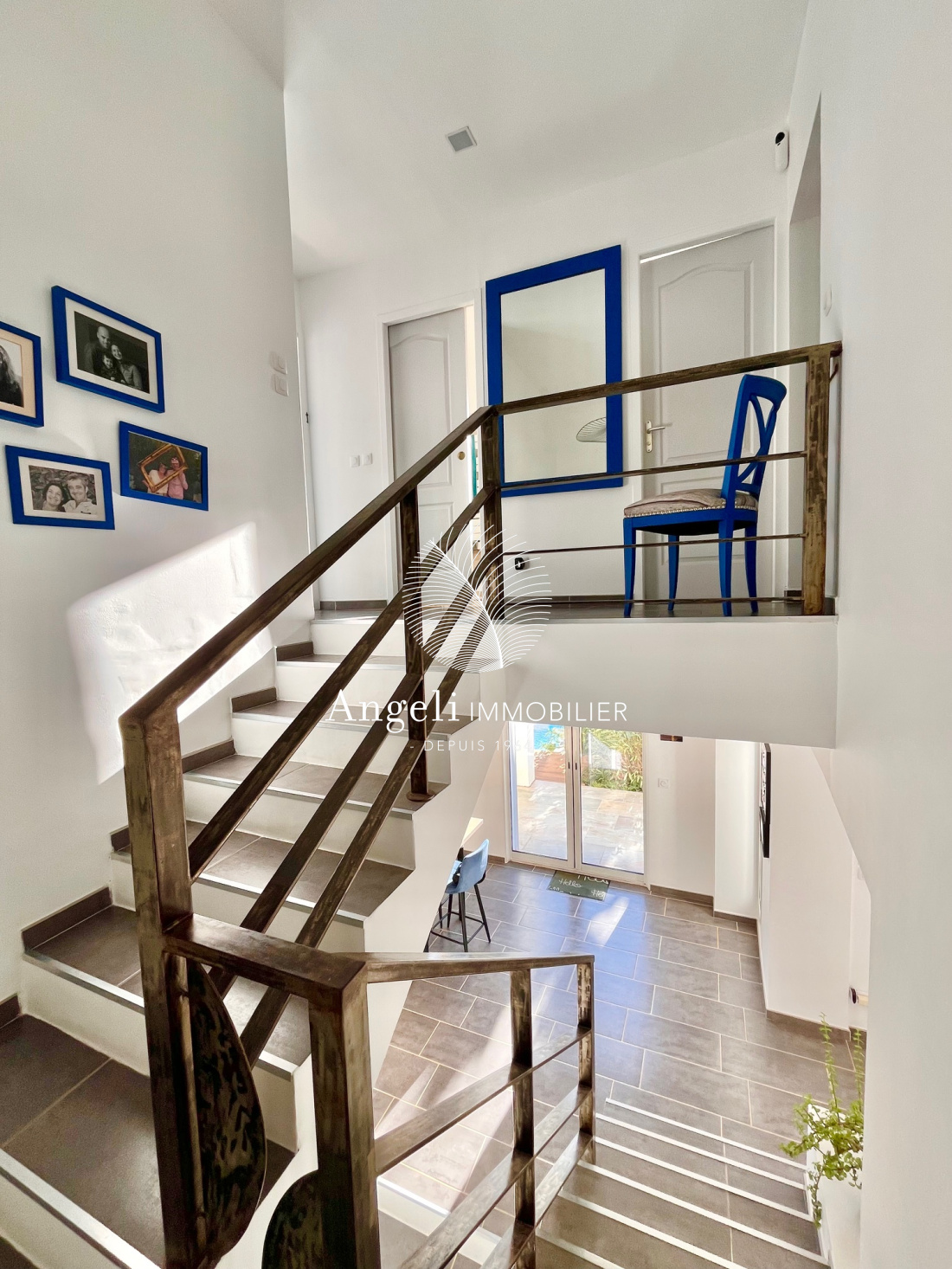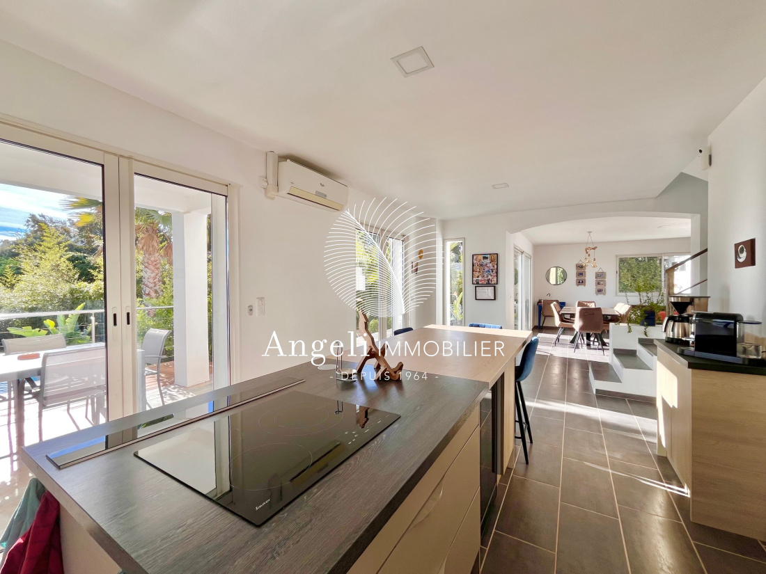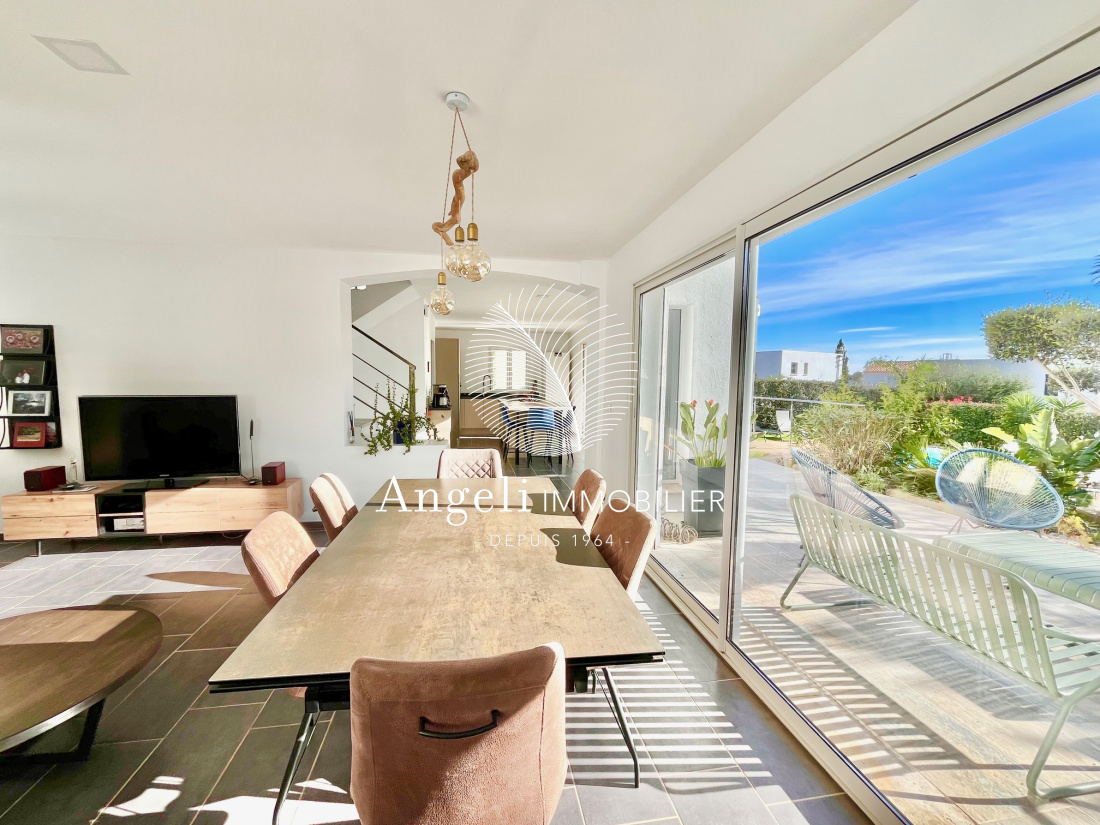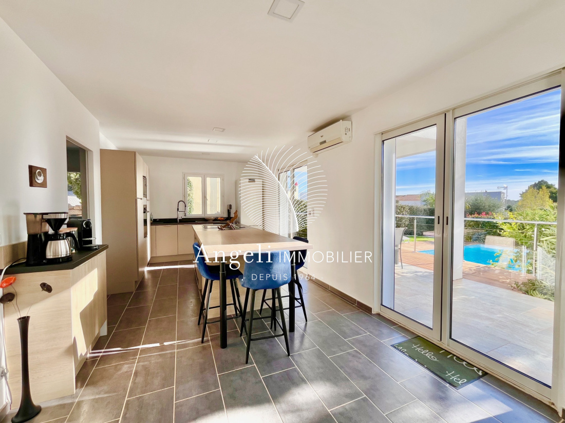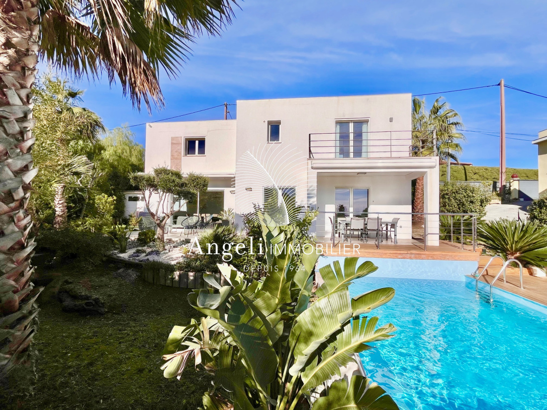 Dans un quartier résidentiel à 3 min du centre-ville, Villa récente au style contemporain avec piscine au chlore, Exposition Est/Sud et se composant comme suit, entrée, demi-niveau inférieur une cuisine ouverte équipée, lumineux séjour, chambre avec salle d’eau, un wc, cellier. Au demi-niveau supérieur, deux chambres, une salle de bains + douche, toilettes séparées. Terrasse offrant un aperçu mer. Accès au garage par l'intérieur. Abri de jardin et carport. Terrain paysagé de 700m² environ. Climatisation, portail automatique, visiophone. Les informations sur les risques auxquels ce bien est exposé sont disponibles sur le site Géorisques : www.georisques.gouv.fr