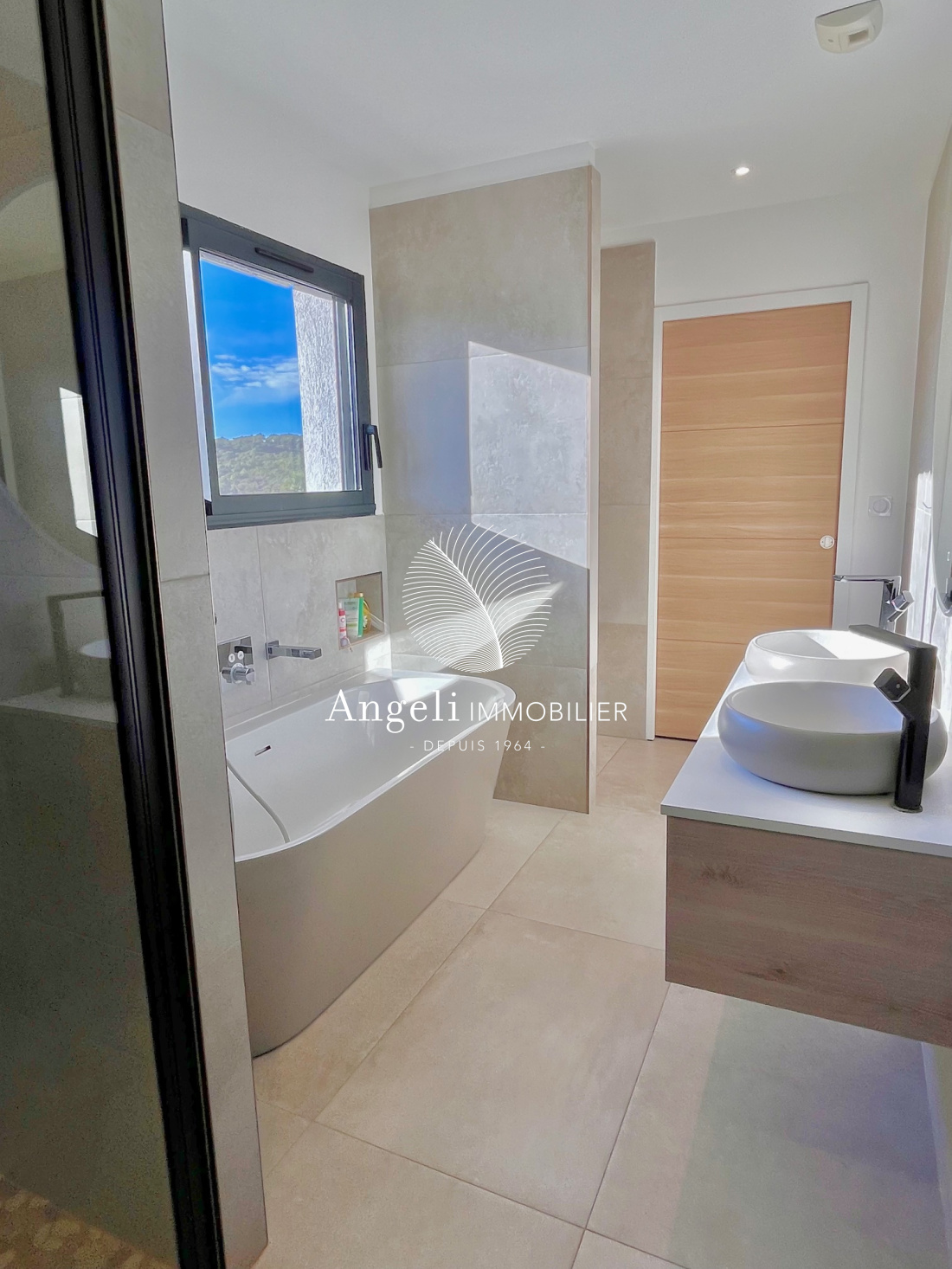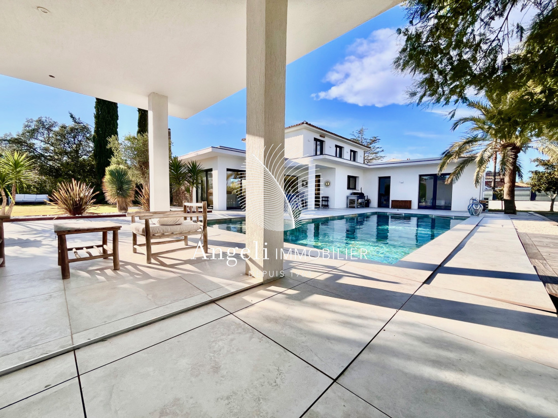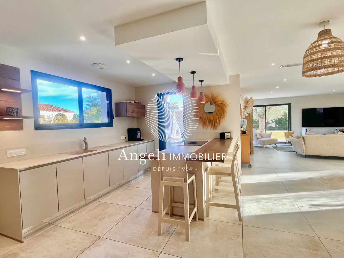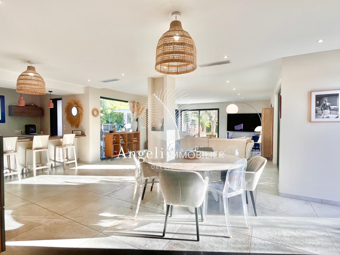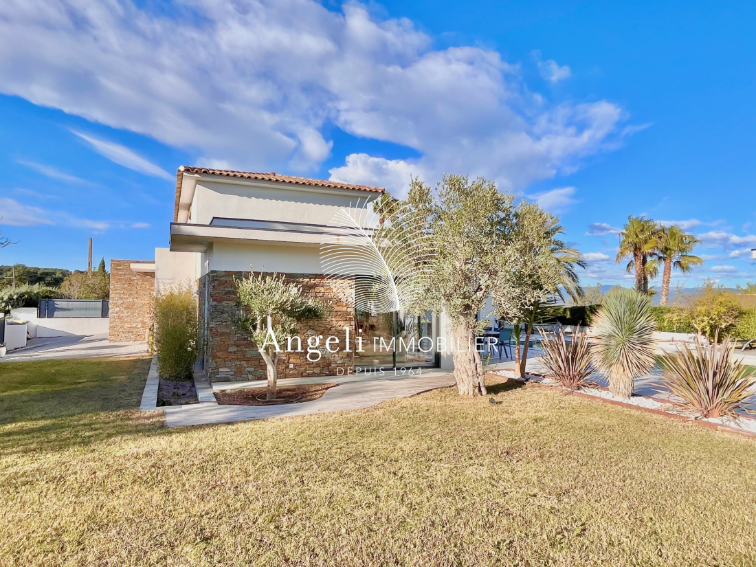 Propriété d'exception sur les collines de St AYGULF, Villa contemporaine récente implantée au milieu d'un vaste terrain plat comprenant la villa principale et un logement de gardien indépendant. Composée comme suit, une entrée, cuisine ouverte sur le séjour, suite parentale avec dressing, bureau, salle d'eau/wc. A l'étage 2 chambres avec espace dressing individuel et salle de bains commune. Accès sur une terrasse offrant une vue panoramique sur la Baie de FREJUS/ST RAPHAEL. Cellier, garage pour les annexes et une piscine à l'abri des regards. Terrain paysagé de 1270m².