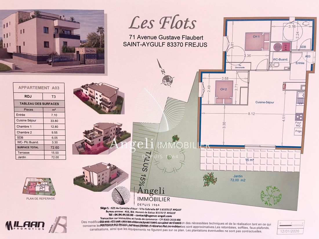 Dans une Nouvelle Résidence du centre-ville, au calme. RARE à la vente. A03 : Appartement 3 pièces de 72,60m² en Rez de jardin comprenant une entrée, espace cuisine ouvert dans le séjour, 2 chambres, salle d'eau et wc. Double exposition Est et Sud. Terrasse de 15m² et Jardin privatif de 72m². Box inclus. Frais de notaire réduit. Venez découvrir ce programme neuf à l'Agence ANGELI IMMOBILIER.
